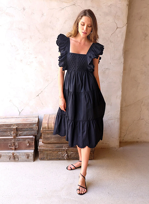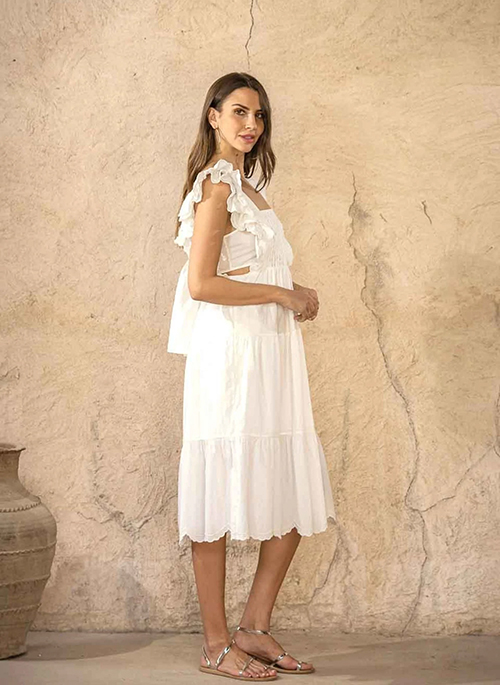 Ruffle mania! Cut from crispy cotton poplin, this midi dress has scalloped ruffles and beautiful fabric manipulations at the front yoke, set by hand. It has cut out at sides and tie bands at back – an easy dress for sunshine days ahead.