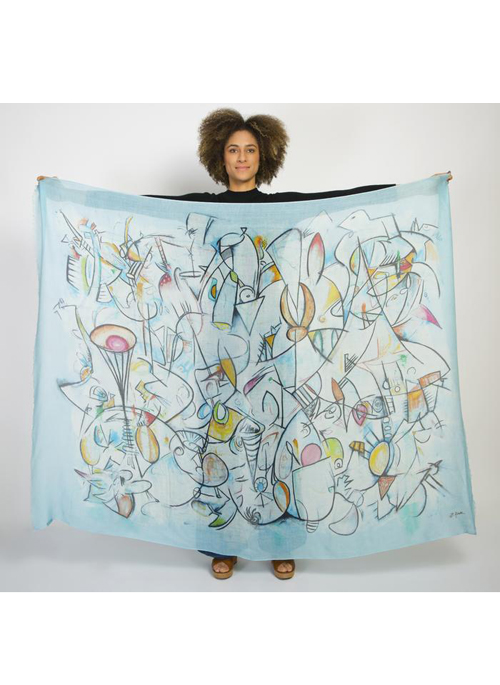 A wrap with complex figures and abstract patterns that will decorate you like an adornment.