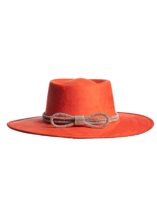 The Take A Bow hat is made of the finest vegan suede. It has an elegant gambler crown, finished with a fine rhinestone trim that defines the sublime and delicate body of the hat.