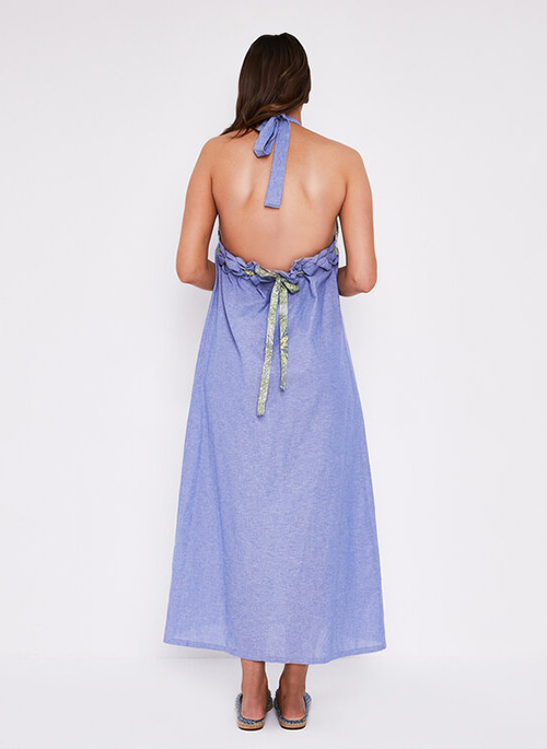 The Cotton Chambray halter dress with braided and adjustable back detail features a tranquil garden print exclusive to Cocoove collections, designed by creative director Ria. The Impressionist collection evokes peace, calm ,coolness. The Tallulah dress can be layered with Tranquillity t-shirt and styled with trainers for daytime.