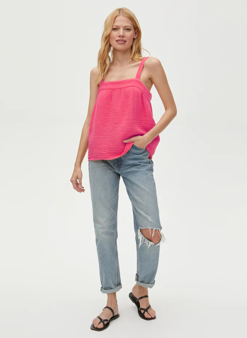 A layering essential. Tamara's raw edges and easy fit give her a relaxed look, while made-in-LA double gauze keeps things cool for summer.