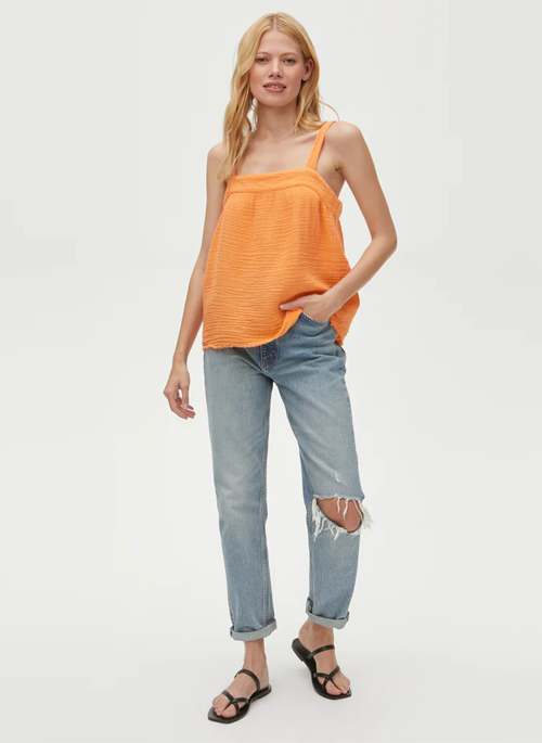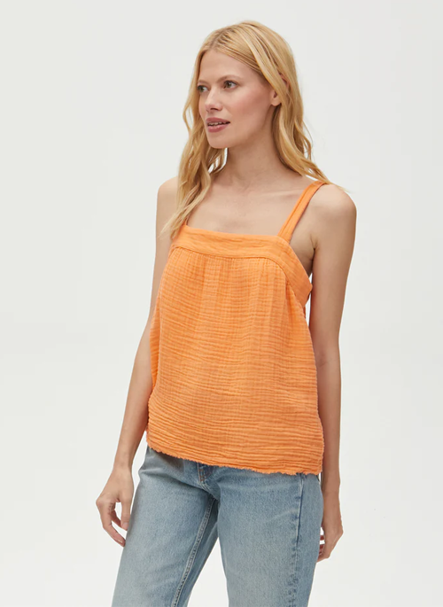 A layering essential. Tamara's raw edges and easy fit give her a relaxed look, while made-in-LA double gauze keeps things cool for summer.