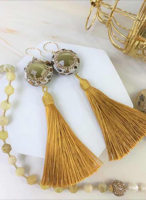 This handmade tassel earrings is made of cat's eye, rhinestones and Japan golden plated brass findings. It's sparkling and beautiful, wear it with simple hair style or tie up your hair both looks gorgeous! Pair with Farra necklace and bracelet to complete your look. Also, this is a very nice gift for birthday, anniversaries or festivals . It will be contained in a nice jewelry box with well packed.