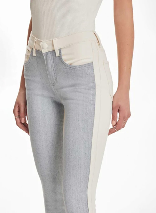 Jeans with a mid-rise style, proposed two fabrics in the same pants, mixing the raw tone/off white with the jeans "blend", modernity and comfort in the same pair.
