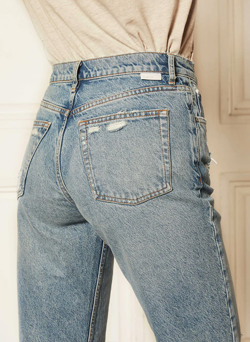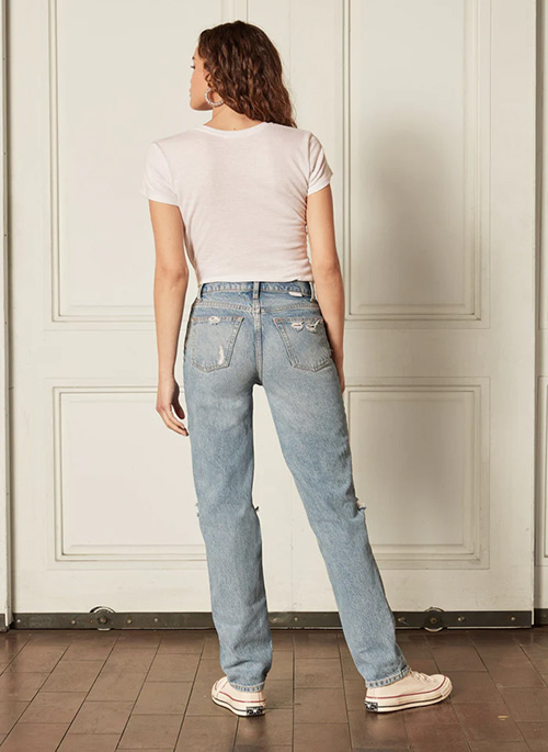 Perfectly imperfect. The Casey is a twist on your favorite vintage jeans. This high waisted rigid straight jean has a relaxed fit and an asymmetrical fly and comes in a medium blue eco wash with destruction. These upcycled jeans include GRS certified recycled cotton and REFIBRA™ Technology, reducing its carbon footprint and reducing water usage.