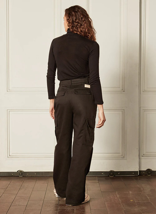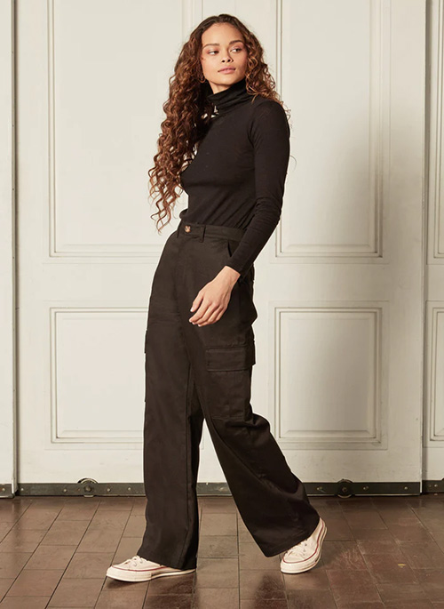 Combining utility and practicality. The Cobain in Black Beauty is a high-rise favorite, featuring oversized cargo pockets on each leg with a wide relaxed leg in a soft twill. This cool-girl fit is made with OCS Certified Organic Cotton and Tencel™ Lyocell, a natural raw material from eucalyptus trees that is responsibly produced to minimize environmental impact, reducing its carbon footprint and water usage.