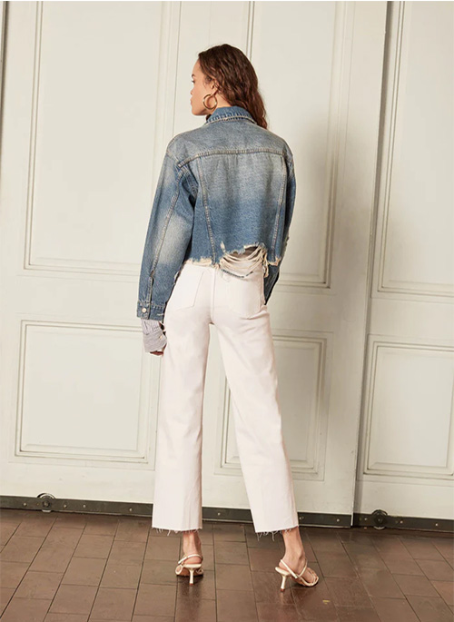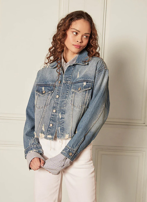 Born to be wild. The Harvey is inspired by your favorite vintage denim jacket. It is rigid and cropped with a raw hem and comes in a perfect medium wash with destruction. This upcycled jacket includes GRS certified recycled cotton and REFIBRA™ Technology, reducing its carbon footprint and reducing water usage.