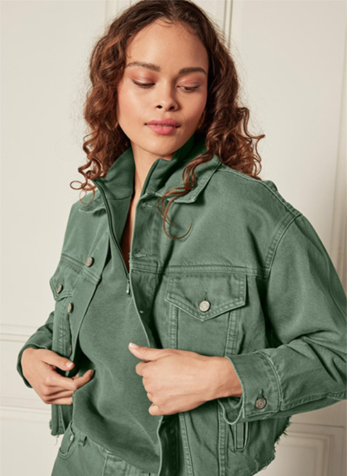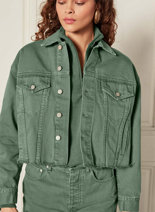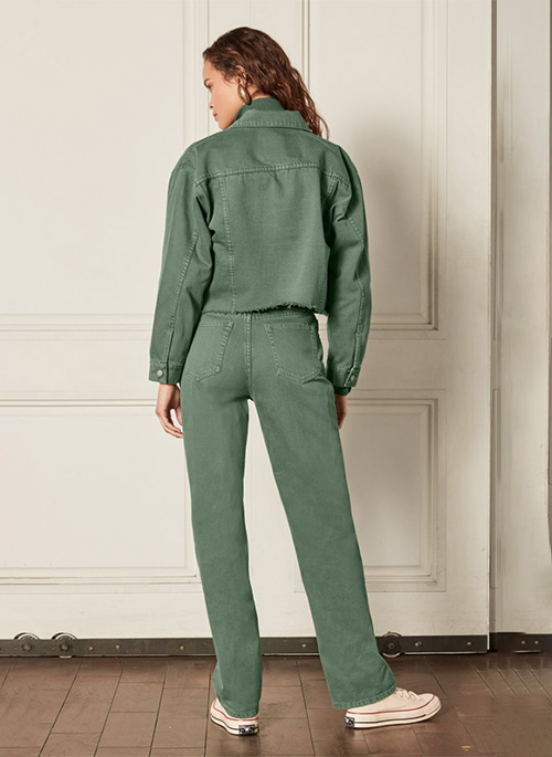 The Harvey is sure to become your next favorite vintage style denim jacket. Paired with our Ziggy in Green Mile, you will look effortlessly cool in our monochromatic look. The Harvey is rigid and cropped with a raw hem and comes in a statement green for the holiday season. This jacket includes GRS certified recycled cotton reducing its carbon footprint and reducing water.