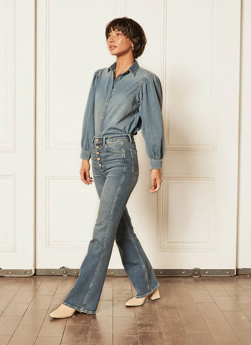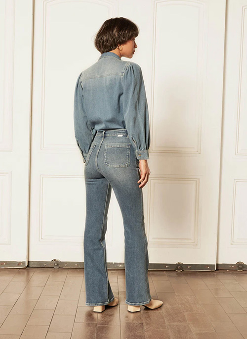 A little Boyish flare. The Ricky in About Time is a high waisted comfort stretch flare jean that will hug your body in all the right places. This jean comes in a medium eco wash with novelty buttons and a unique back pocket shape. Pair with the Porter denim shirt for the full Boyish look.