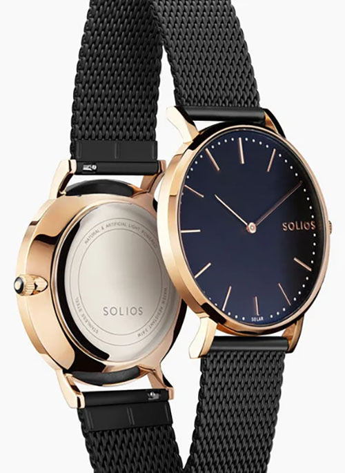 The Solios Solar Watch perfectly combines aesthetic, green technology, and durable materials. The 8mm thin Rose Gold 316L stainless steel case is topped by a Black dial with a minimalist style and offers a water-resistance of 3 ATM. The hardened mineral glass is covered with a robust sapphire crystal to limit scratches. At the heart, a solar cell allows the watch to recharge by itself and offers a 6-month energy reserve. In addition to promoting slow fashion with style, you'll never have to change your battery.