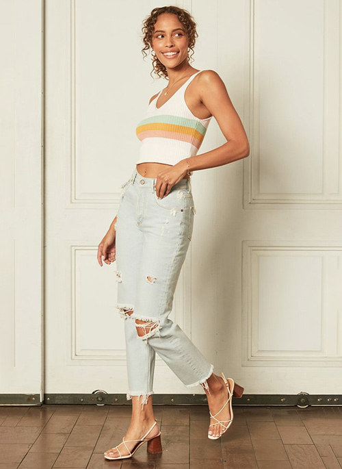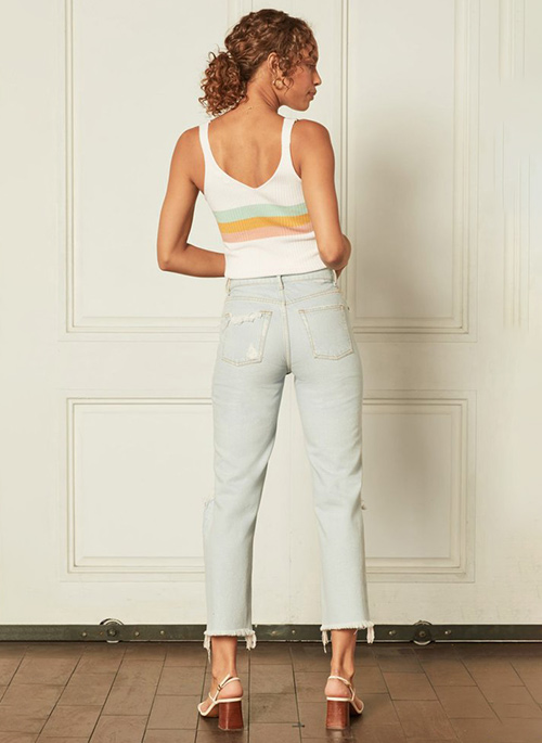 Straight-up versatile. The Tommy in Spectacular Now is a high-waisted rigid straight jean in a super light blue eco wash with destruction. These upcycled jeans include GRS certified recycled cotton and REFIBRA™ Technology, reducing its carbon footprint and reducing water usage.REFIBRA™ Technology takes fashion industry scraps and recycles the waste, which is then blended in with TENCEL™, a natural raw material from responsibly produced eucalyptus trees to minimize environmental impact.