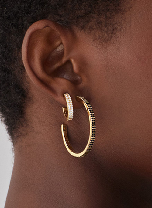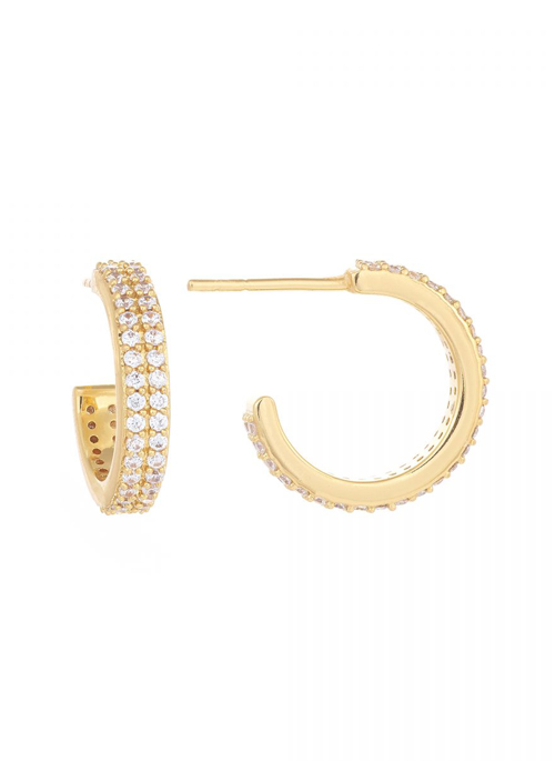 Classically designed small hoop earrings in lustrous gold-plate. Closely encased, delectable gemstones add sparkle and life. The perfect day-to-night-time, take-me-anywhere option. Available in white, blue or black cubic zirconias.