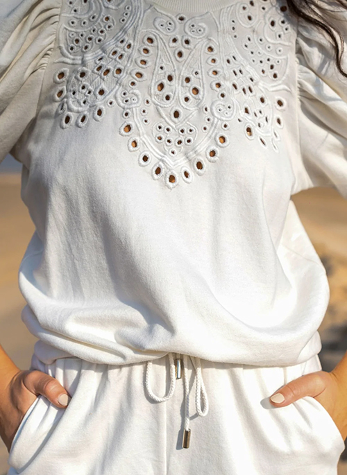 Beautiful cutwork embroidery at front is what makes this sweater totally unique and feminine. It has a soft puff sleeve and a straight silhouette. SET it up with the matching shorts COMFORT FIRST and you have the ultimate travel kit or lounge set for the sunny part of the year.