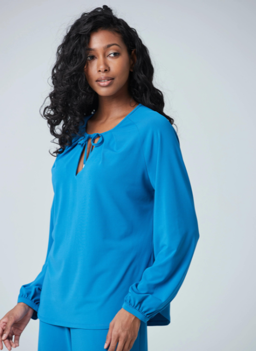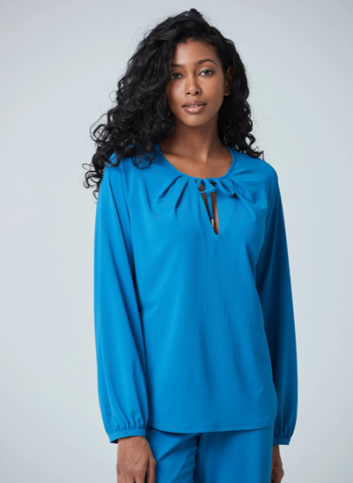 Matte Jersey with billowy sleeves and charming detail on the neck. You can wear the pieces in several ways either very casual or very chic depending on your needs.