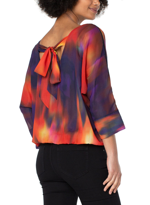 Make a statement in this gathered hem dolman tie back top in a beautiful Northern Lights print. Perfect for brunch or special occasions. Pairs beautifully with denim or knit leggings.