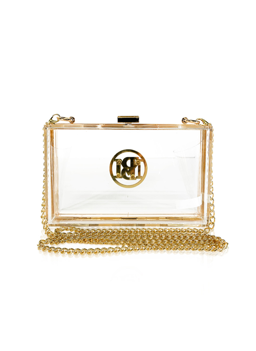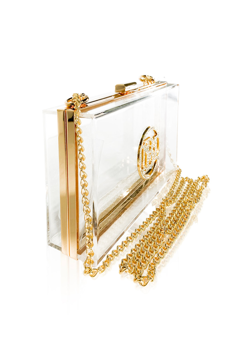 - Our crystal-adorned logo is the highlight of this piece, stunning against a clear backdrop. The gold chain and detailing ensure this fashion-forward statement look also adds an air of luxury and metallic beauty to your look.
