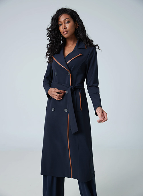 This trench coat is the perfect coat for the arrival of cooler weather. Classic silhouette with a touch of leather. This timeless piece is machine washable. The color and cut make it unique.