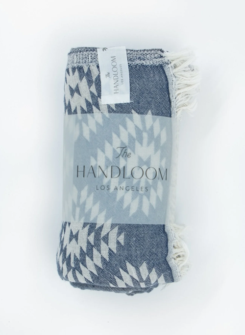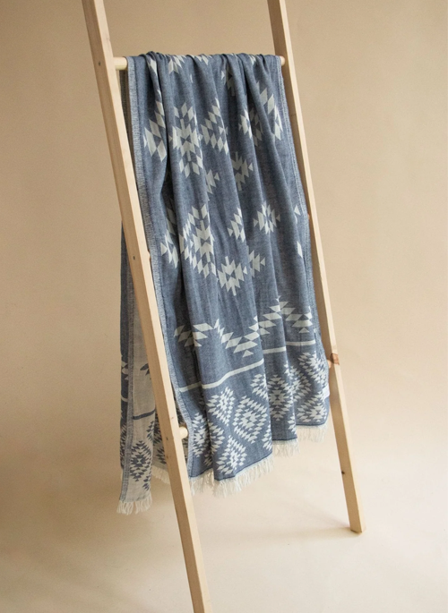 Our best-selling Tribe Towel Navy is anything but basic. Double-sided and beautifully designed, it brightens up a room with a geometric motif and delicate frayed edges. Absorbent, quick drying fibers make it an efficient bath towel that you can pack for trips to the beach. It can also be used as a decorative throw on furniture—or as a cozy shawl or scarf. Its many uses and efficient features make it the perfect travel companion.