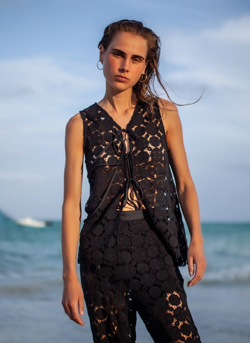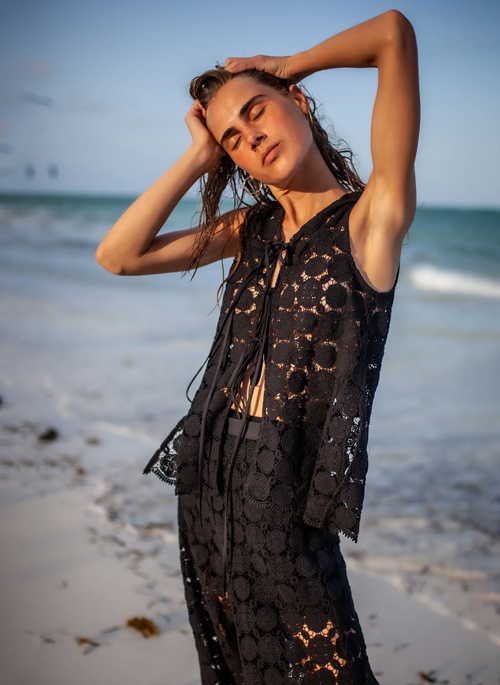 Our bestselling Tula top in this black doily lace is the sexiest new top in our summer lineup. Tie it in the back for full frontal coverage or tie it in the front and show off your sun-kissed skin. No matter how you wear it, pack it into your beach bag as a chic coverup by day and then add our matching Pamela pants and turn up the sizzle on a hot summer night.