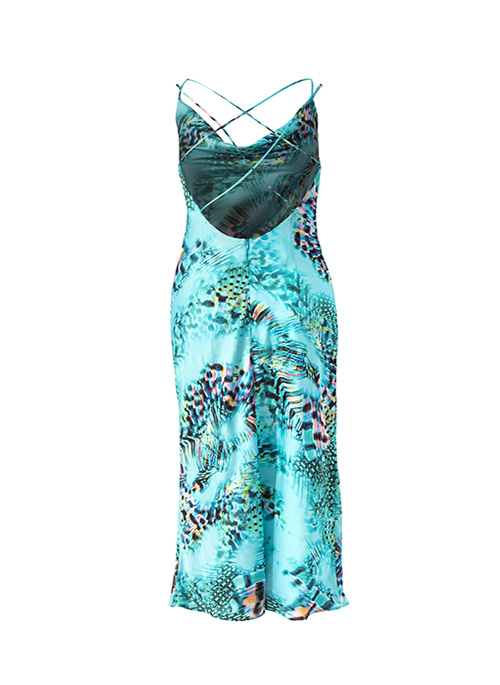 Cowl back midi dress in a silk touch fabric with a luxurious sheen.