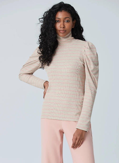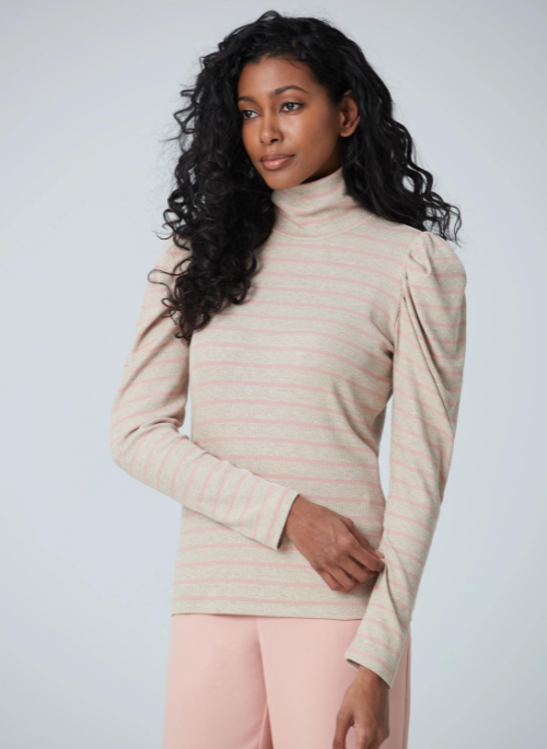 Striped Turtleneck top puffed sleeve A classic and trendy long sleeves rib top. Very comfortable and can be worn casual in the comfort of your home or at work.