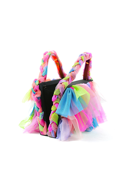 - Multi colored tulle fabric briefcase bag with a braided fabric handle