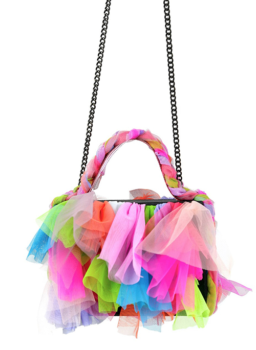 And just like that....multi-color tulle fabrics came together to make a rainbow we call the Tutu Briefcase. You don't need to be a ballet dancer, nor do you need to channelize any characters of Sex & the City to carry this clutch, but our fabulous Tutu can definitely make you want to pirouette! Strike a fierce pose holding the tulle braided handle or sling over your shoulder with our signature metal chain to go hands-free. No matter how you carry her, this bag is sure to evoke emotions of delight and amusement!