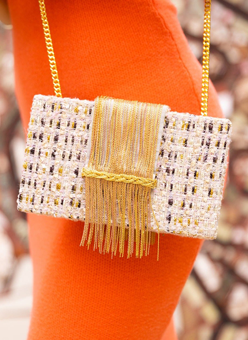 Another beige but not boring number from the design mind of Simitri. Preppy tweed embraces glitzy fringes and shows off an unexpected friendship in our Toasted Tweed Dreamy! Great to wear for gatherings with professional and also to dress up your tee and jeans for day of being a tourist in a new city.