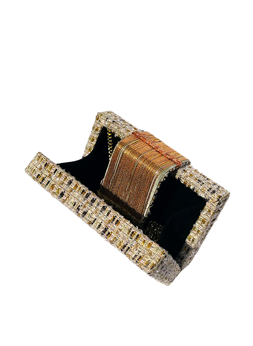 - Beige tweed fabric with a braided flap and gold metal hanging chains