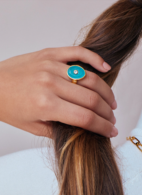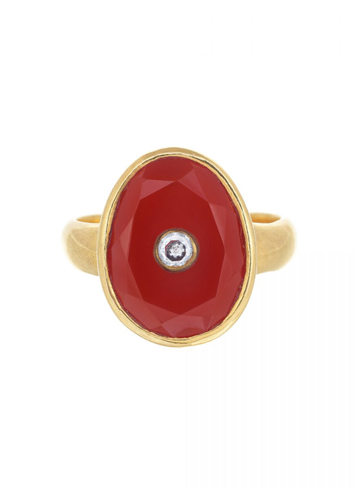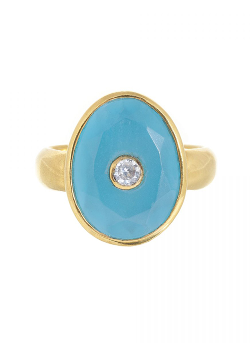 A classic inspired by India’s jewelry tradition – the large, vertically placed oval, faceted gemstone is the perfect foil to a central glittering cubic zirconia, encased in the robust gold-plate. Available in Black, Green or Red Onyx, or Blue Chalcedonia.