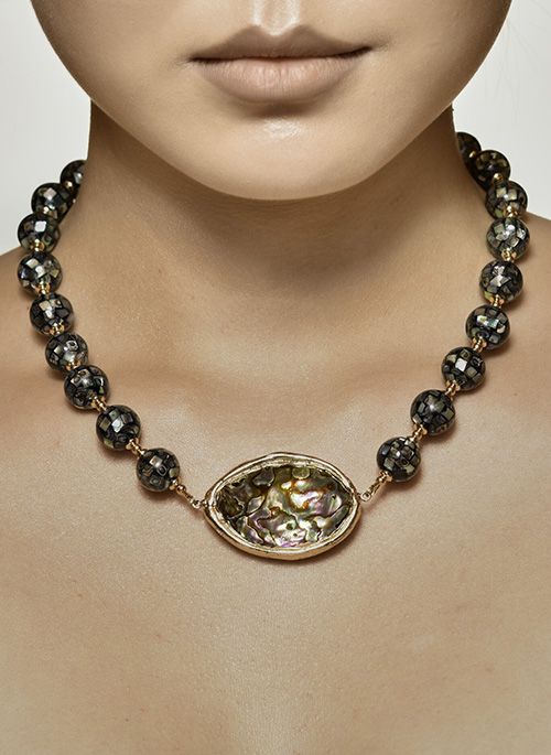 The Ula Abalone Mosaic necklace is inspired by the sunset hue of the sea, the golden organic border is artfully formed around each abalone beads. "Ula" (a girl's name of Celtic origin meaning "gem of the sea") is inspired by the sunset hues reflecting on the ocean and the unique identity of the abalone shell itself. What's truly special is that no piece is the same. Each abalone shell is a precious gift from nature and has its own story to tell.
