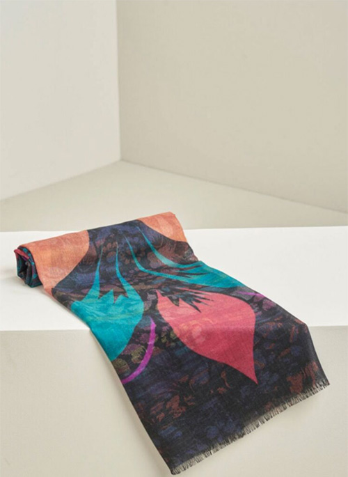 This soft and elegant floral shawl is inspired by Peruvian "Retablos", making it a unique piece. 79"/77" X 28" inch. 0.14 lbs.