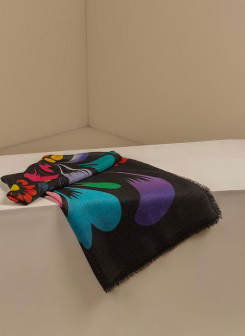 This shawl is one of our favorite pieces from the collection. A soft accessory that transmits joy with its colorful printed design. Made with Baby Alpaca and Silk, in square format. Baby Alpaca is an especially soft grade of Alpaca. Alpaca fiber stands out for being as soft as Cashmere, but warmer, lighter, and more durable. Alpaca is also water repellent and keeps you warm even when wet. Pair with one of our 100% Baby Alpaca Sweaters and you are sure to stay warm, comfortable & stylish in any setting.