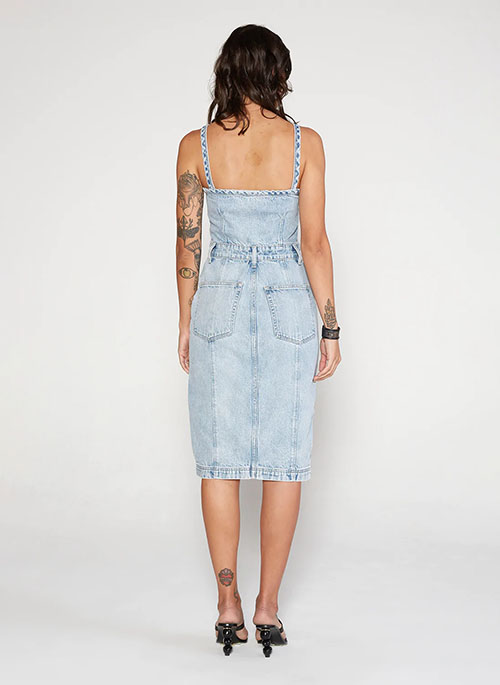 Contrast seaming and deep pockets add to the utilitarian vibe of this chic denim dress, while adjustable straps and subtle darting create the perfect fit.