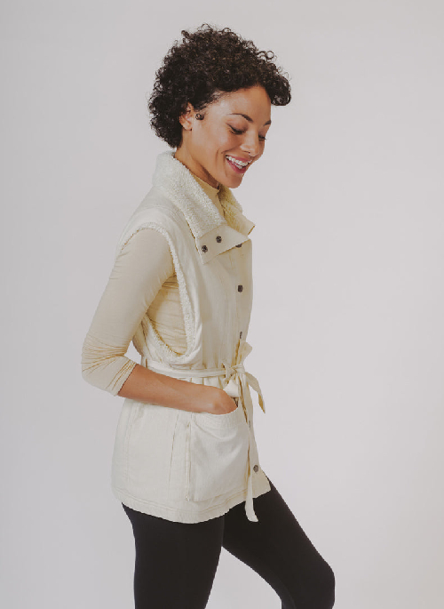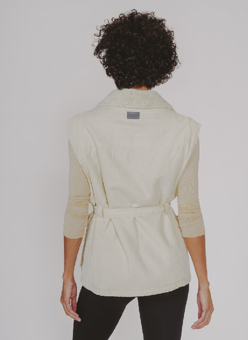 A statement item and one of our faves this season. Our utility herringbone fabric is sherpa-lined and features contrast thread against the winter white for a little edge to the clean white, extended shoulder detail, and features a dropped armhole for a super flattering cut. This can be worn belted for a super cinched look or w/o a belt--either way you're pulling it off. This look is especially elevated when paired with a white base layer for a monochromatic statement.Details: