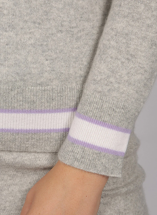 Lightweight vee neck with contrast colour tipping at neck trim and tonal stripe details at hem & cuff. Starburst to reflect the tonal shades in the sweater.