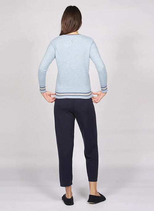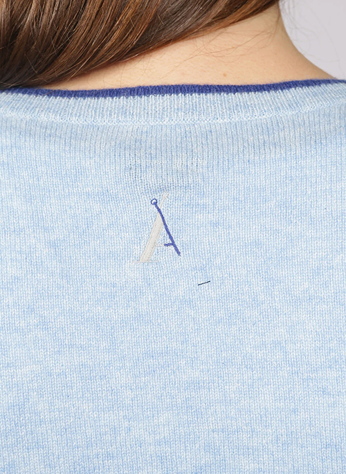 Lightweight vee neck with contrast colour tipping at neck trim and tonal stripe details at hem & cuff. Solid star to reflect the tonal shades in the sweater.