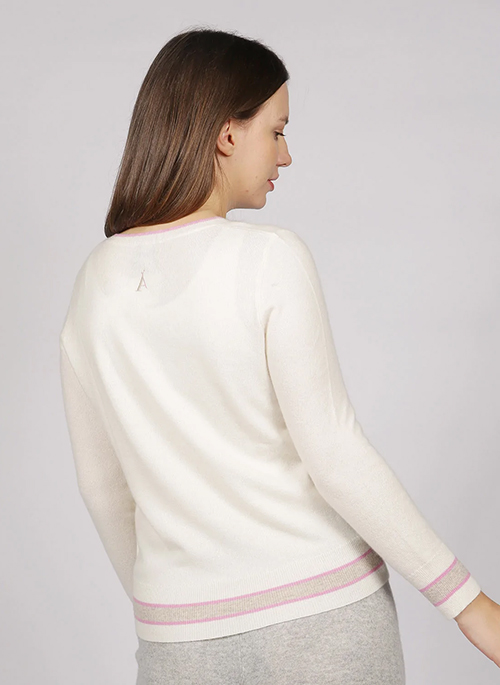 Lightweight vee neck with contrast colour tipping at neck trim and tonal stripe details at hem & cuff. Starburst to reflect the tonal shades in the sweater.