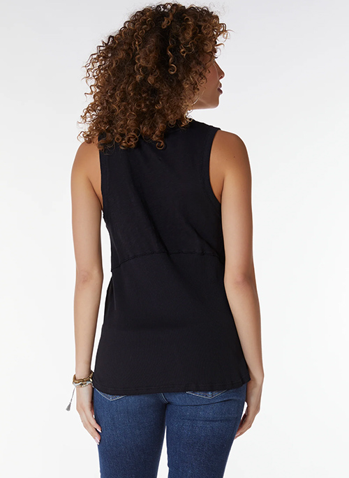 The side seams on this tank are shifted forward to create a step hem and it has a ribbed panel across the lower back. Designed with a classic fit, raw edge details, and a hi-low hem--a stand out tank to add to your closet!