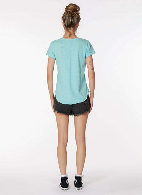 This classic V-neck tee was given a new look with raw edges at the sleeve, hem, and down the front center seam.