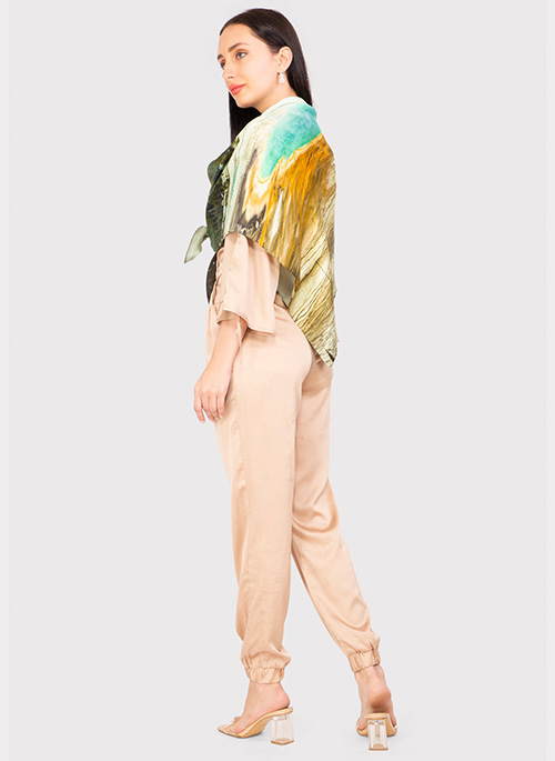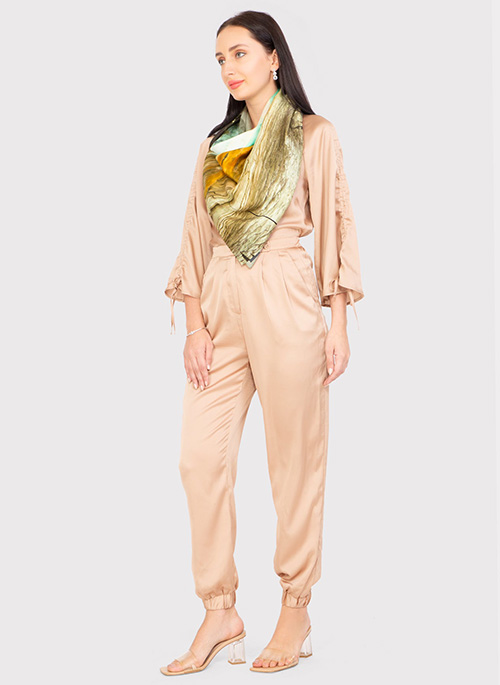 A classic silk square scarf with a grand prismatic print inspired by Maneesha's travels.