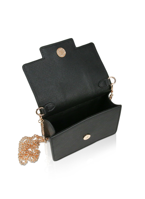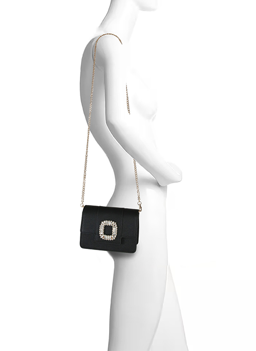 - Crafted from the most exquisite faux leather, this stunning clutch boasts a design that exudes both elegance and style. The crystal brooch on the magnetic snap adds a touch of luxury to this already stunning piece, while the 22" drop removable chain allows it to be worn in different ways—making it perfect for any special occasion. Beautiful Jewel Badgley Mischka plaque on the back.