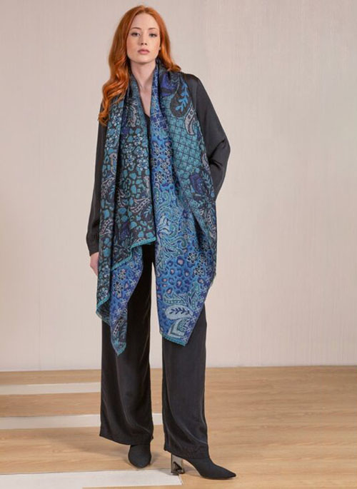 A work of art turned accessory. Impossible to ignore. This incredible three-sided stole creates a unique and versatile piece. Its inimitable jacquard design combines lurex, alpaca and silk. Pair with one of our 100% Baby Alpaca Sweaters and you are sure to stay warm, comfortable & stylish in any setting.