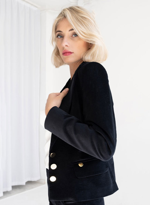 Blazer with gold buttons in soft black cotton velvet with a slight stretch for a perfect fit. Matches well with our velvet dress, skirt, and trousers.
