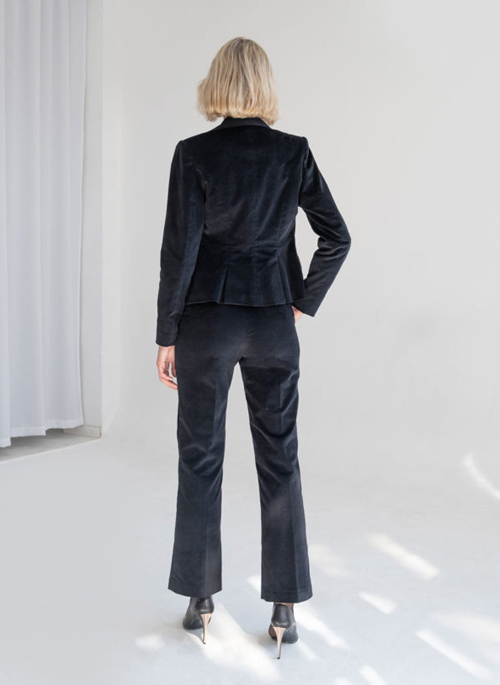 Flared trousers in soft black cotton velvet with light stretch for a perfect fit. Gold button detail on the pockets.