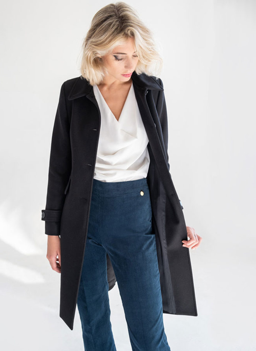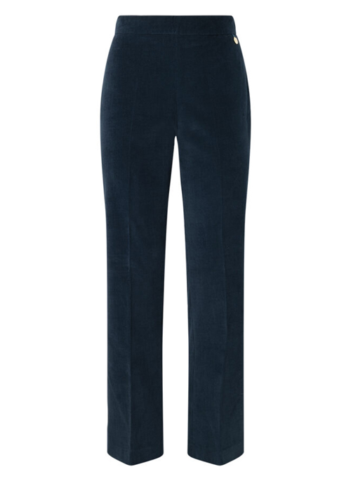 Flared trousers in soft cotton velvet with light stretch for a perfect fit.Coordinates with petrol blazer. Available in size XL.