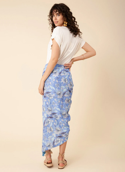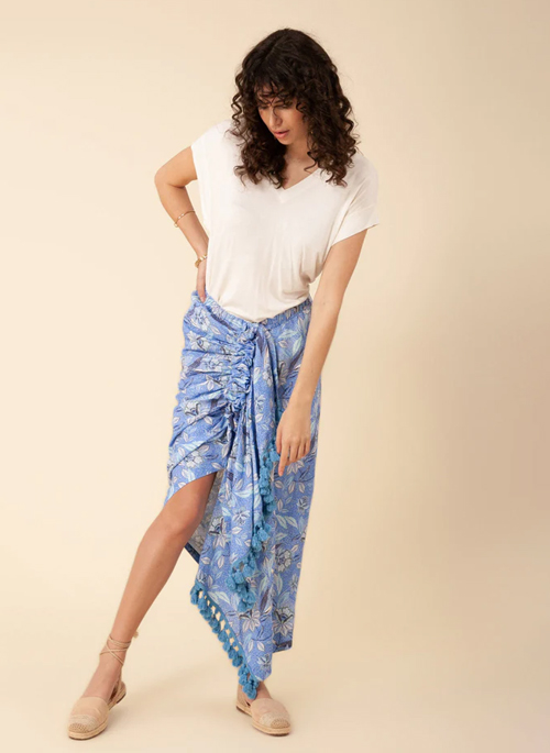 Details: Garment Washed Linen Draped Skirt with Zip at Front Cotton Tassel Trim at Drap