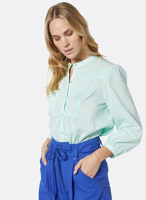 Like a Mediterranean dream, The Vesta evokes feelings of adventure and ease with its relaxed silhouette and can be worn every day with jeans. This cotton top stands out with details like pin tucking on the bib and the sleeves that add a touch of romance.