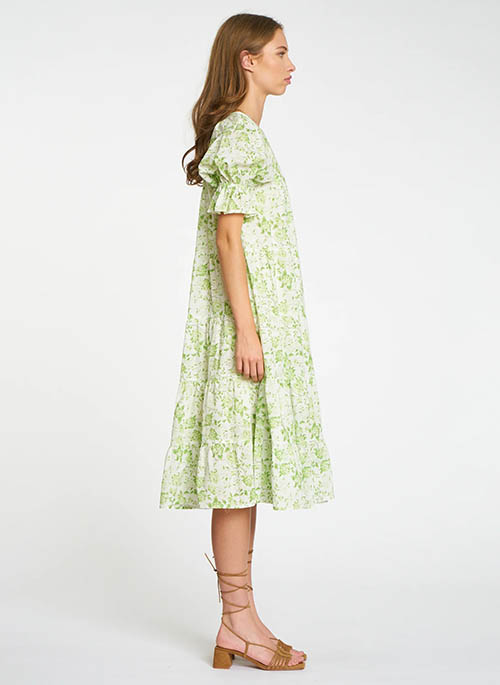 With its modest ruffled neckline, drop-shoulder detail, and 3/4 sleeves gathered at the cuff, the Victoria midi dress is both fanciful and feminine. Cut in a Green Garden floral print fabric, this dress is both fun and feminine with subtle flair.