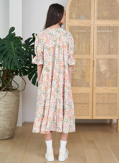With its modest ruffled neckline, drop-shoulder detail and 3/4 sleeves gathered at the cuff, the Victoria midi dress is both fanciful and feminine. Cut in a dreamy, Spring Blooms print of orange, green and pink florals set against an ivory ground, this dress is both fun and feminine with subtle flair.